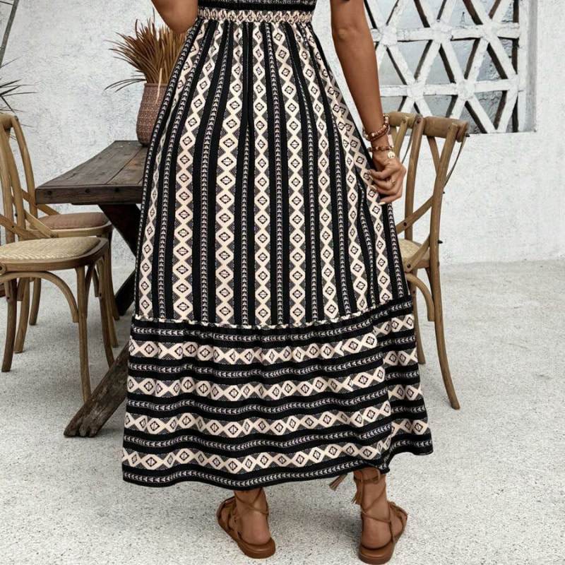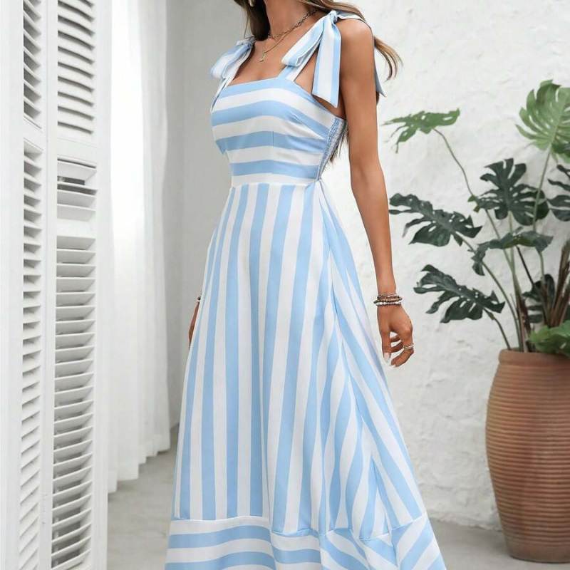 Striped patchwork suspender large swing dress with high waist fashion